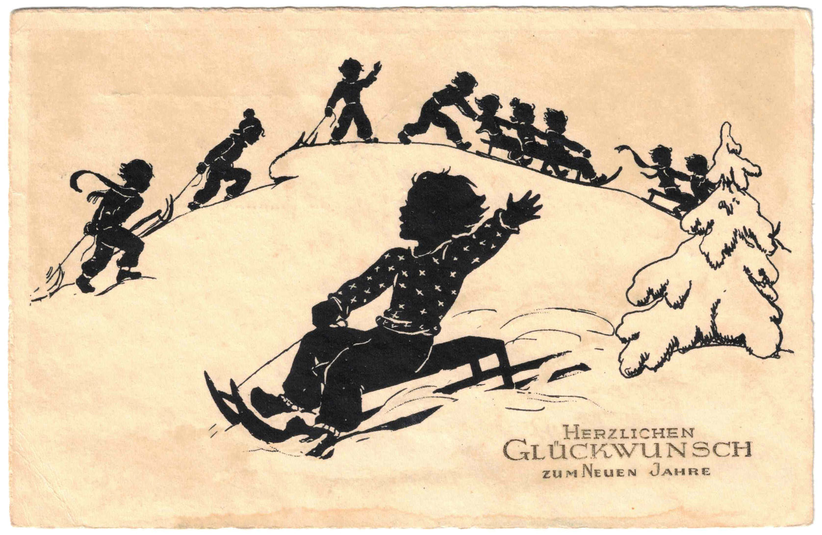 Datei:Postkarte Scherenschnitt LoreGronau Kinder Schlitten.jpg