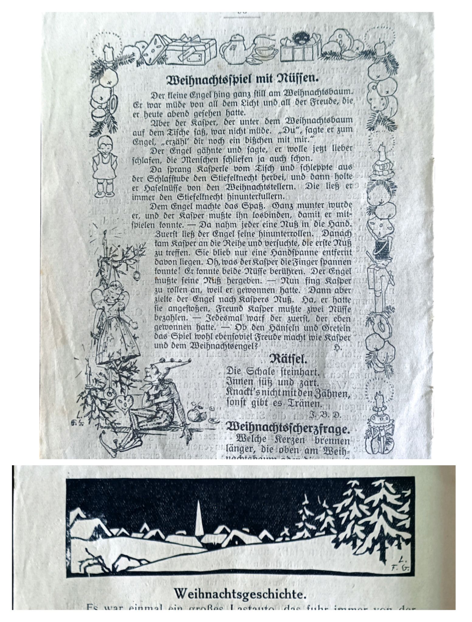 Hänsel und Gretel - der deutschen Kinder Freudenborn, Lore Friedrich-Gronau|| 1932 || 41 || 6 || Dezember || Weihnachten || je eine Grafik zu "Weihnachtsgeschichte", S. 94ff und "Weihnachtsspiel mit Nüssen", S. 96