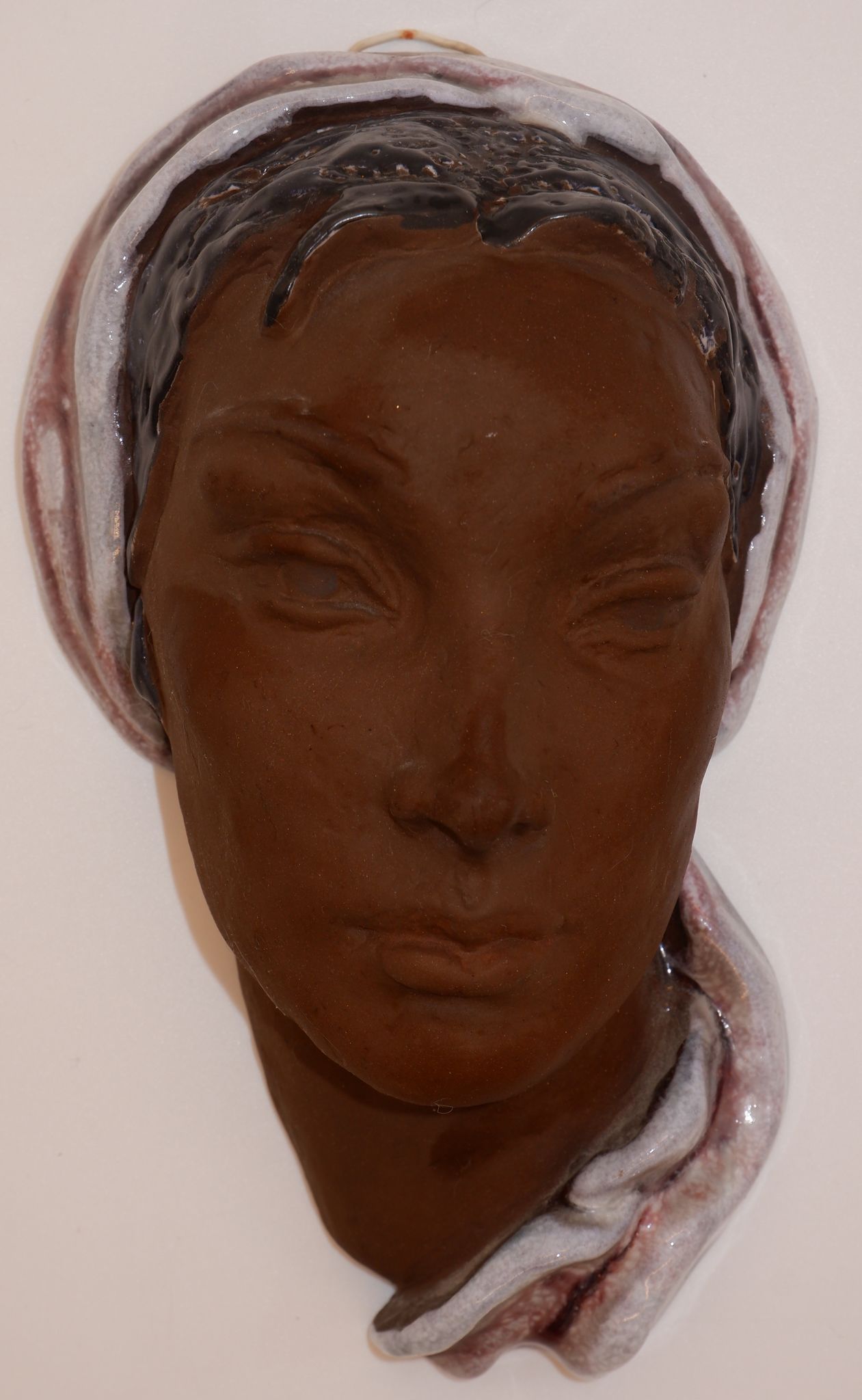Karlsruher Majolika, Maske, Frau mit Kopftuch, gebogener Hals, Haar sichtbar, Lore Friedrich-Gronau, Entwurfsjahr 1958, Nummer 6558 (sehr wahrscheinlich, von NR zugeordnet), teilglasiert, Foto Copyright Rensmann