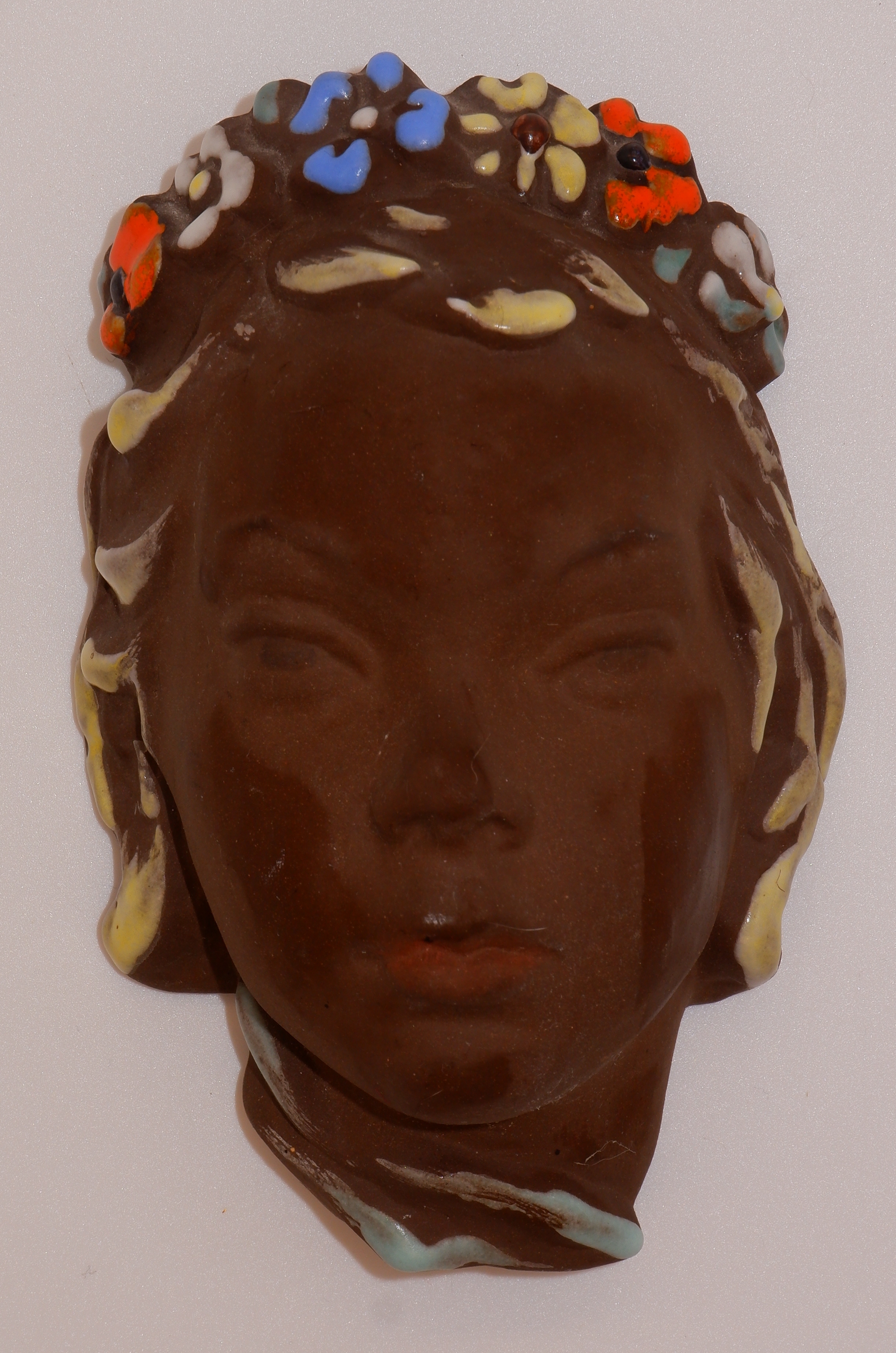 Karlsruher Majolika, Maske, Frau, Blumenkranz im Haar, Halsansatz sichtbar, Lore Friedrich-Gronau, Entwurfsjahr 1958, Nummer 6560, teilglasiert, Foto Copyright Rensmann