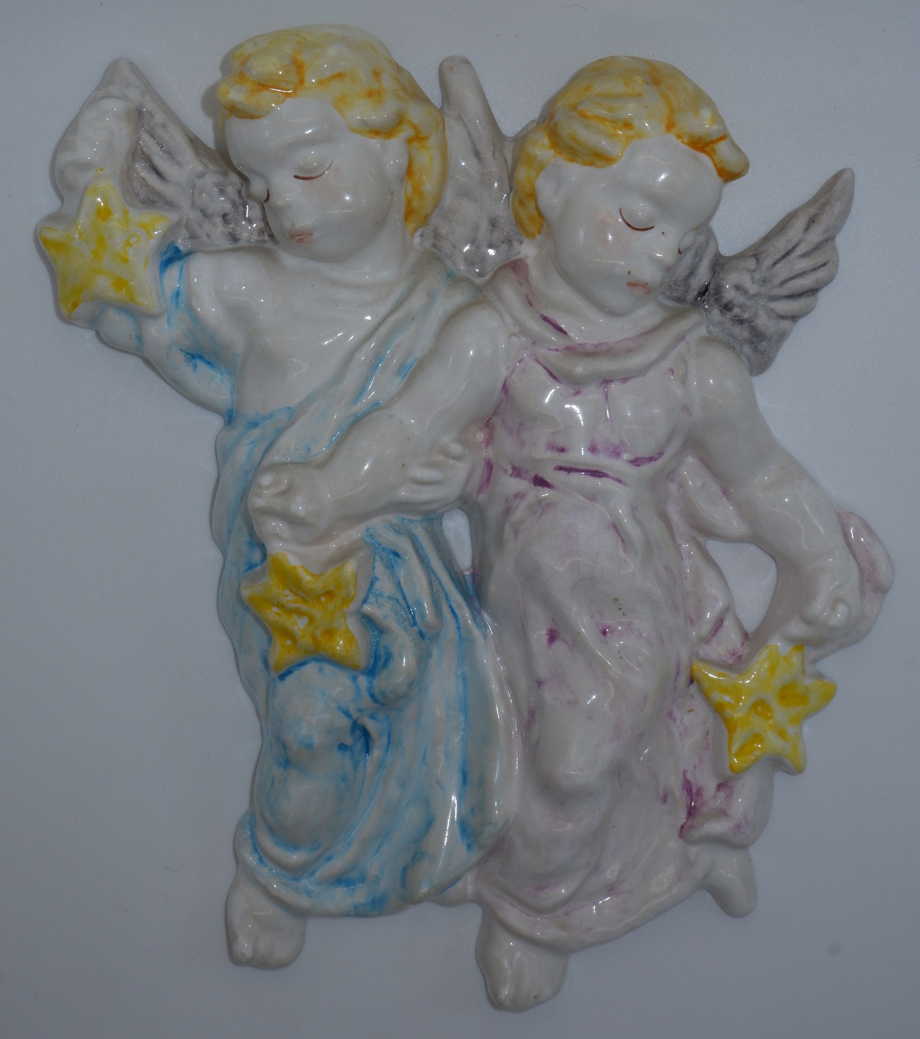Karlsruher Majolika, Engelpaar, zwei Engel mit geschlossenen Augen, Gewänder schwebend, drei große Sterne, Lore Friedrich-Gronau, Entwurfsjahr 1960, Nummer 6616, vollglasiert, Foto Copyright Rensmann