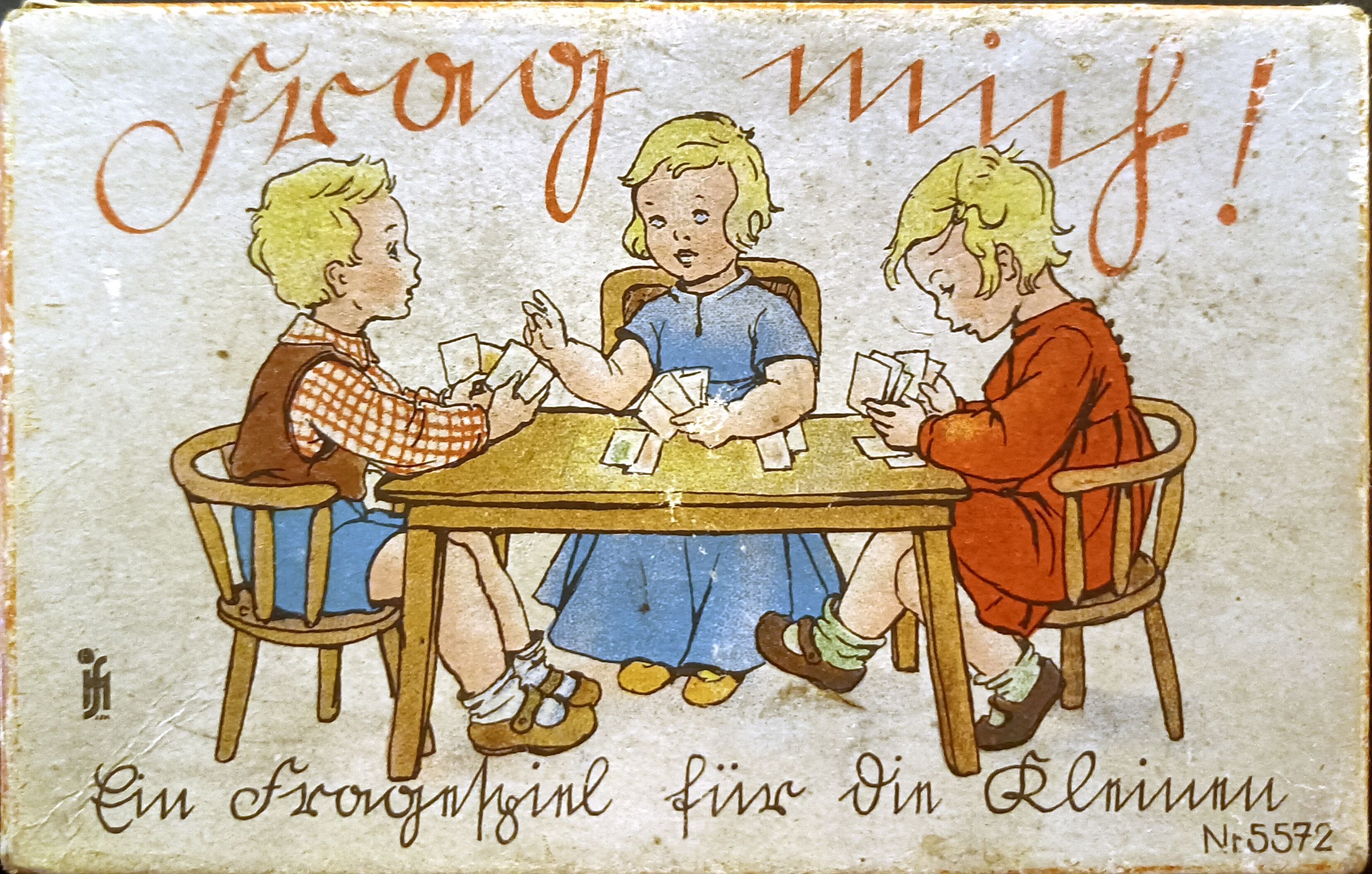 Lore Friedrich-Gronau, Frag mich!, Ein Fragespiel für die Kleinen, In Sütterlin, 32 Karten, auf der Vorderseite Bild und Text, kindliche Motive auf weißem Grund, inkl. Anleitung mit Hinweis an "Vati und Mutti", Jos. Scholz Verlag, Nummer 5572,