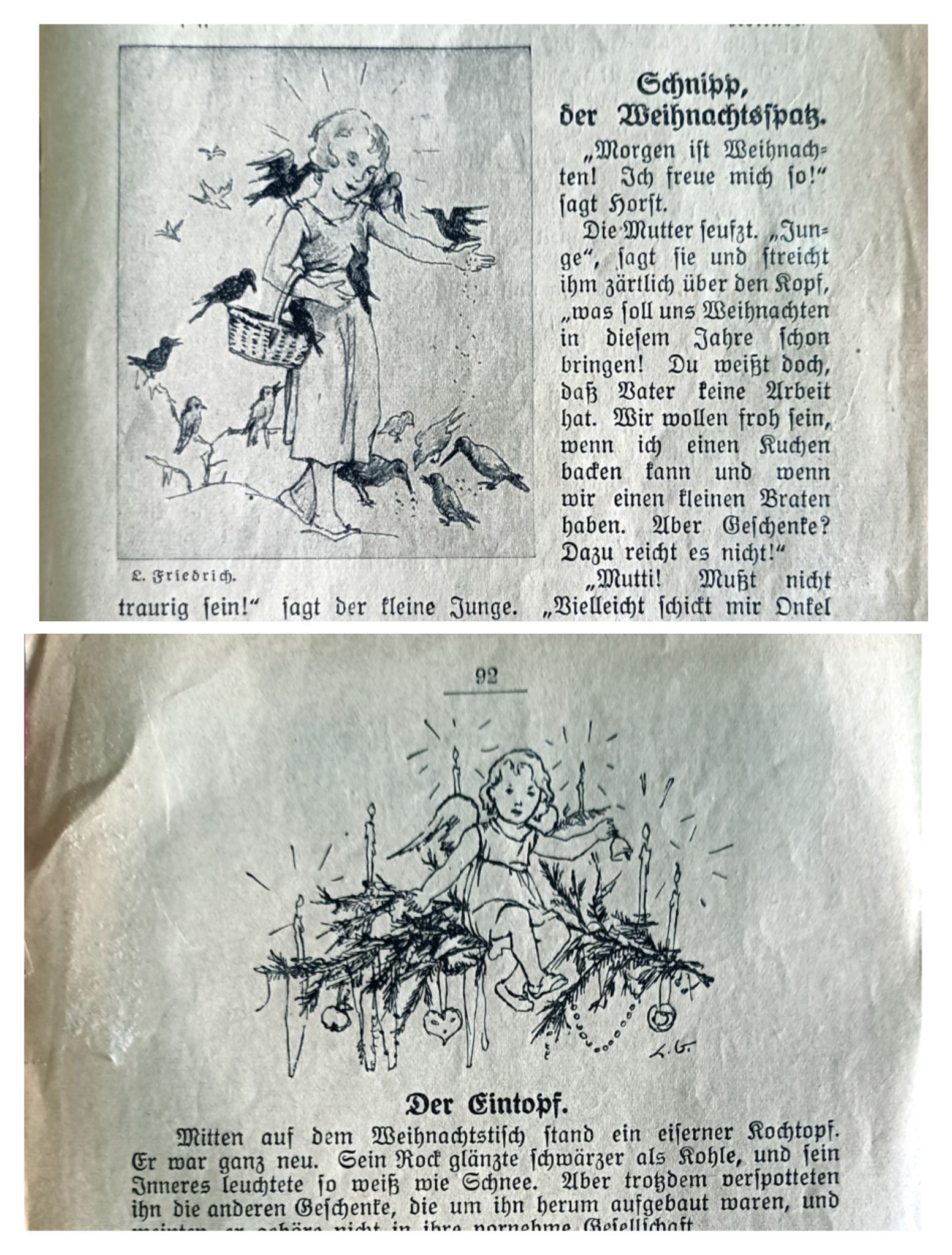 Hänsel und Gretel - der deutschen Kinder Freudenborn, Lore Friedrich-Gronau, || 1934 || 43 || 6 || Dezember || Weihnachten || 1. "Schnipp, der Weihnachtsspatz", S. 80 2. "Der Eintopf" (Engel auf Tannenzweig), S. 92