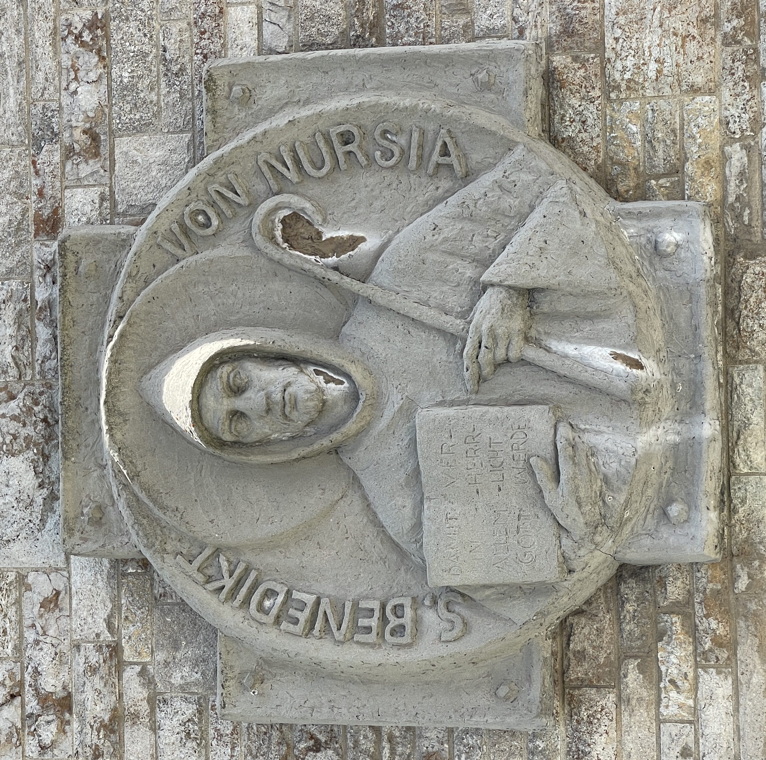 St. Benedikt, Tondo Der heilige Benedikt in Nursia,| Abtei Münsterschwarzach Außenwand Pforte, Lore Friedrich-Gronau, Foto Copyright Rensmann