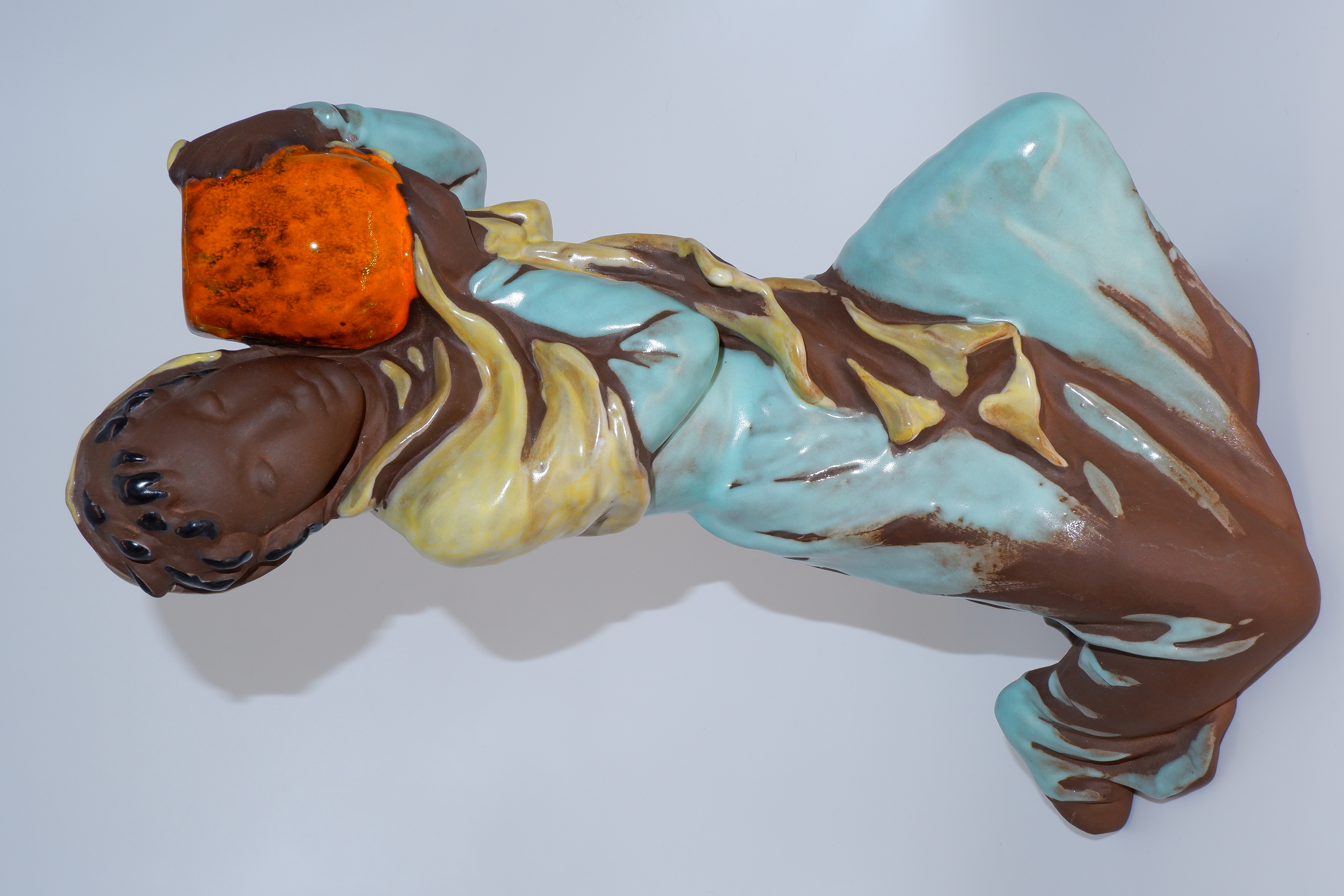 Karlsruher Majolika, Leuchter-Kerzenträgerin, Wasserträgerin, knieend, trägt die Schale auf der linken Schulter (meist ist die Schale in rot), Entwurfsjahre 1956, Nummer 6132, bemalt, Foto Copyright: Rensmann