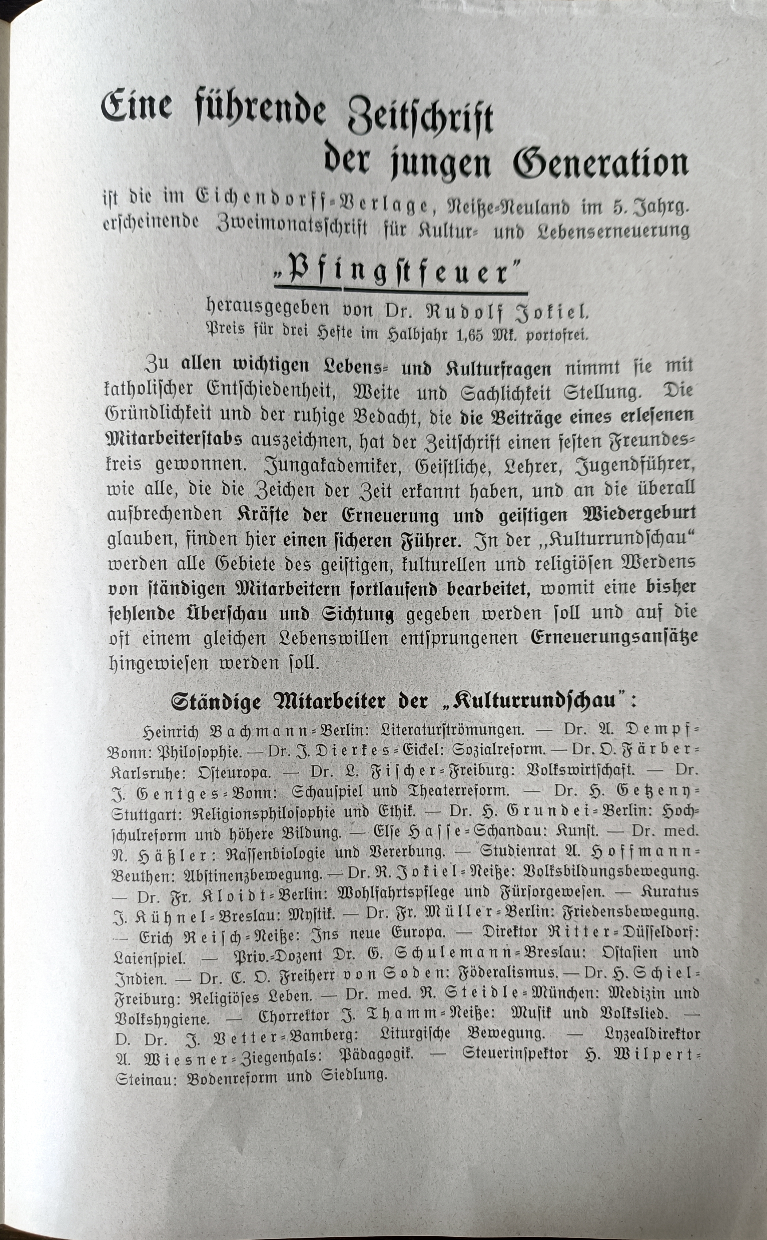 Informationen über die Zeitschrift Pfingstfeuer im Rahmen einer sechsseitigen Werbebroschüre zu Maria geht über die Erde von Lore Gonau., Foto Copyright: Rensmann