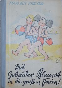 Lore Friedrich-Gronau illustrierte das Buch "Mit Gebrüder Blaurot in die großen Ferien! Frohe Erlebnisse in See, Sand und Sonne" von Margrit Freyer, erschienen 1937 im Franz Borgmeyer Verlag, Hildesheim. Auf den 174 Seiten, gebunden in Halbleinen, finden sich fünf Illustrationen, auch das bunte Cover stammt von Lore Friedrich-Gronau.